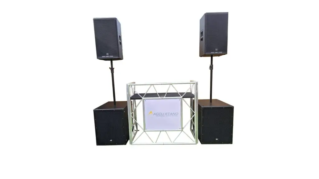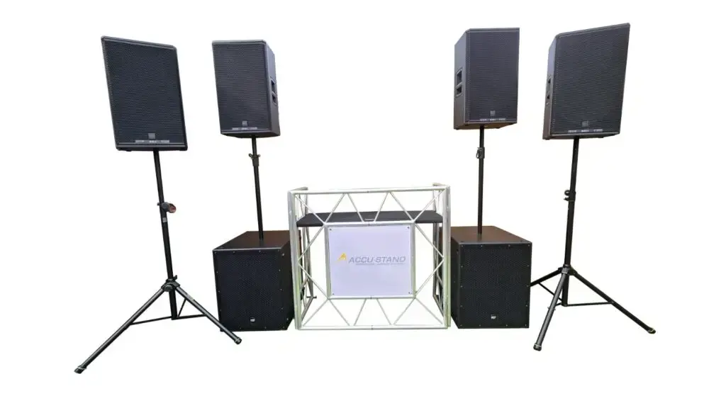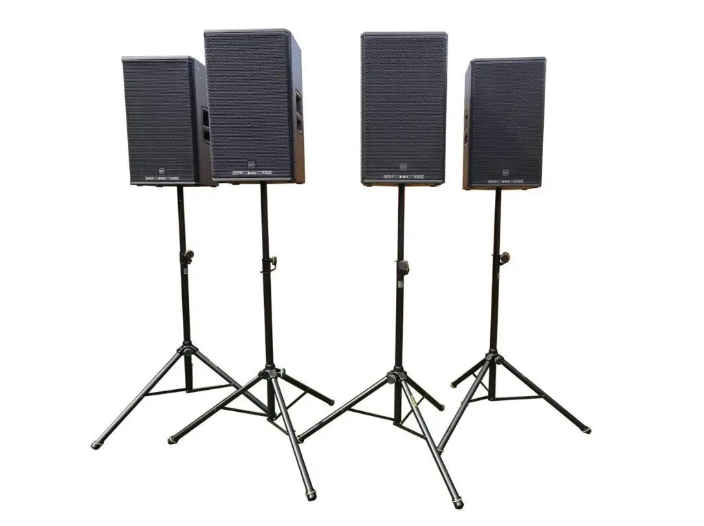 Wij werken met hoogwaardige RCF-apparatuur (NX915-a tops en 8004-as subwoofers), waardoor spraak altijd verstaanbaar is en muziek krachtig en gebalanceerd klinkt, zonder overheersend te zijn.